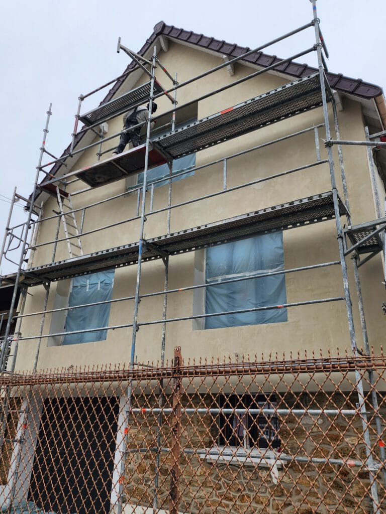 Après la pose des panneaux isolants en EPS haute densité, un enduit beige clair taloché a été appliqué, avec des encadrements blancs nets autour des ouvertures. L’ensemble a permis de sublimer le style traditionnel de la maison tout en améliorant ses performances thermiques.