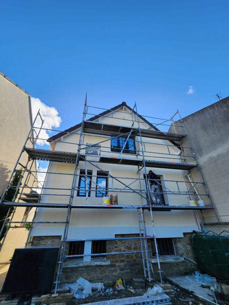 La façade a été entièrement reprise avec un système d’isolation thermique par l’extérieur (ITE), alliant performance énergétique et esthétique.